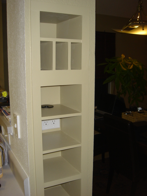 Other side of kitchen entry with cubbies built in columns...notice the electrical outlet to charge our phones